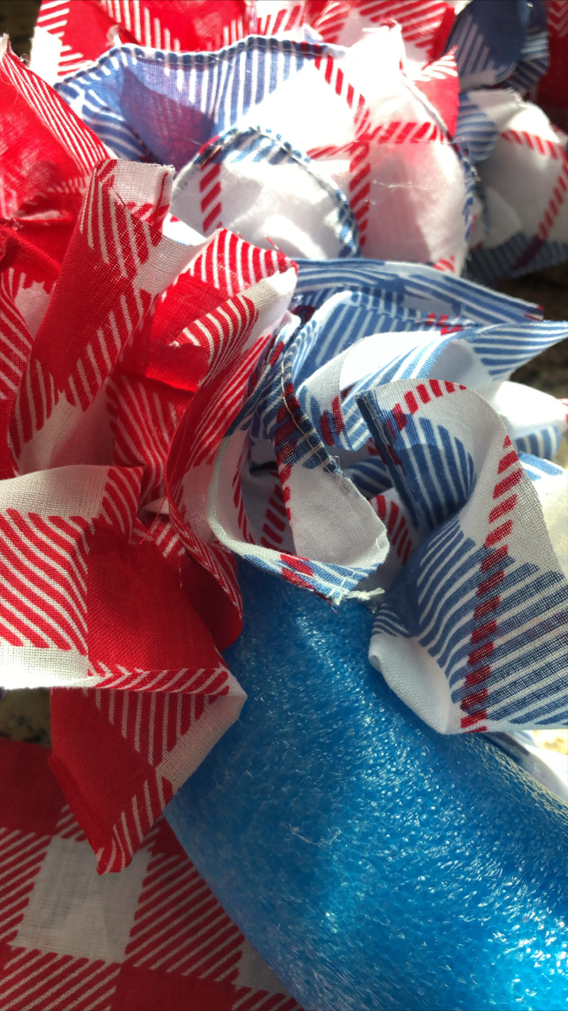 Let’s start with this cute 4th of July handkerchief wreath. I found the handkerchiefs at the Target dollar section. This wreath was so easy and inexpensive to make! I used a pool noodle as a base which is in the outdoor section at Target and is less than $5. I duct taped the pool noodle together. Then I cut my handkerchief into squares and used a hot glue gun to gather/bunch them in the center and then glued them all around the tube with hot glue. I found that gluing three at a time one on top, one in the middle and one the bottom, then working my way around the tube made for a great pattern.